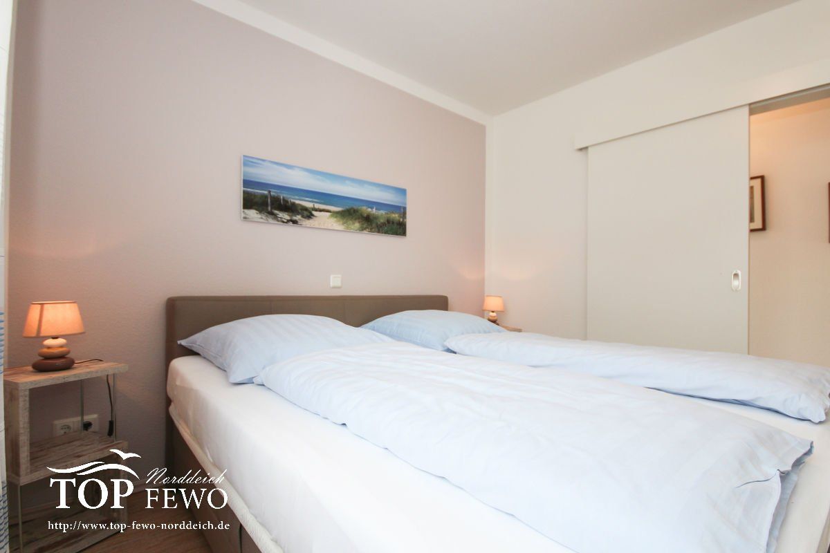 Ein großes Schlafzimmer mit einem Boxspringbett in Komforthöhe, ein Einzelschlafzimmer mit eigenem TV - Gerät, ein Duschbad mit bodentiefer Dusche & Fenster bieten Ihnen die besten Voraussetzungen für einen erholsamen Urlaub.